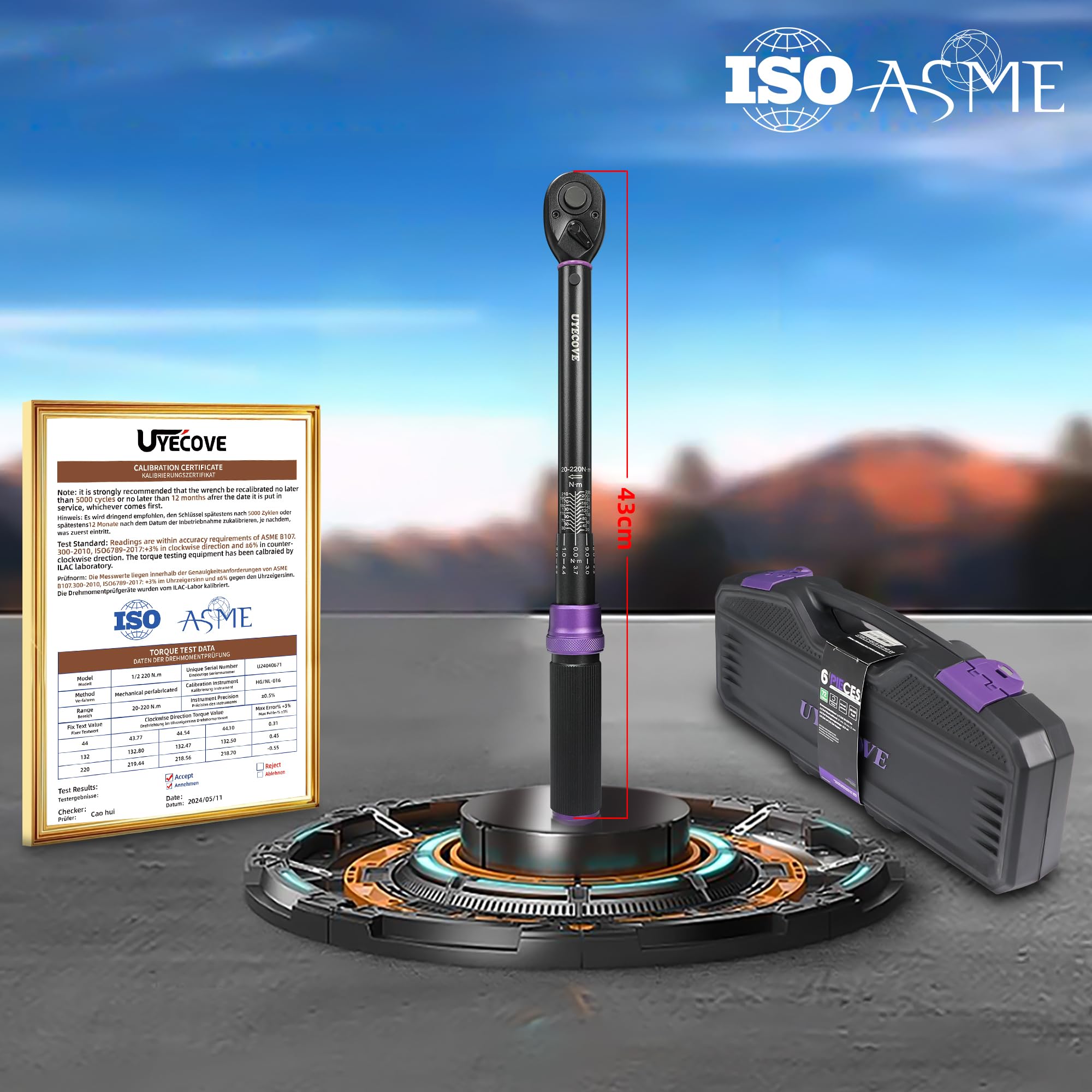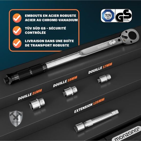 Les mécanos pros et amateurs attention ! Cette clé dynamométrique UYECOVE 1/2\ est essentielle pour serrer précisément (40-220 Nm) sans sur- ou sous-serrage. Précision ±3%, certification incluse. Le set de 5 pièces comprend la clé, une barre d'extension et des douilles 17,19,21mm. En aluminium robuste, double échelle Nm/FT-LB, et avec mallette de rangement. Parfaite pour la voiture, moto, vélo, ou bricolage. Un outil pro pour des serrages parfaits à chaque fois !